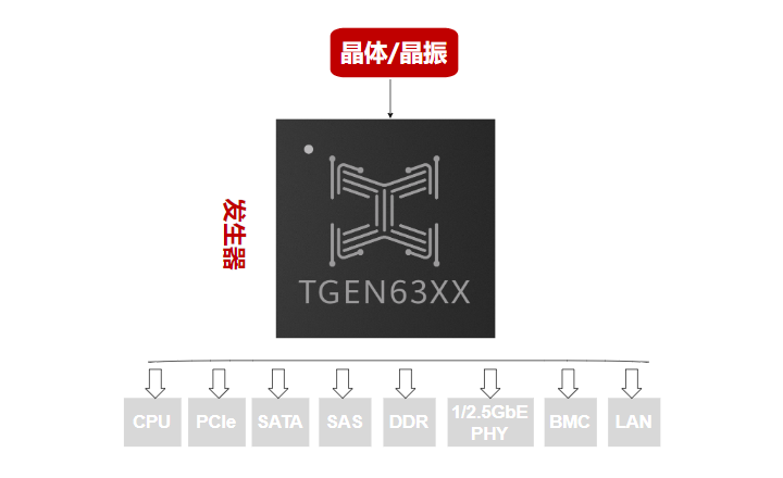 | TGEN6320 | 3.3V | 晶体/晶振 | LP-HCSL | 25MHz或100MHz | <50fs | 19 | -40℃~85℃ | QFN100 |